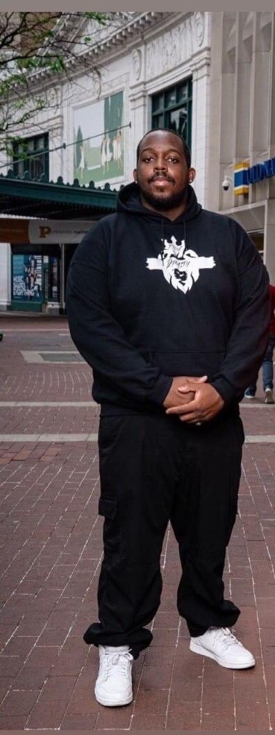 Close-up of a person wearing a black hoodie with 'Young Lynety University' logo and text on the front, standing against a concrete wall.