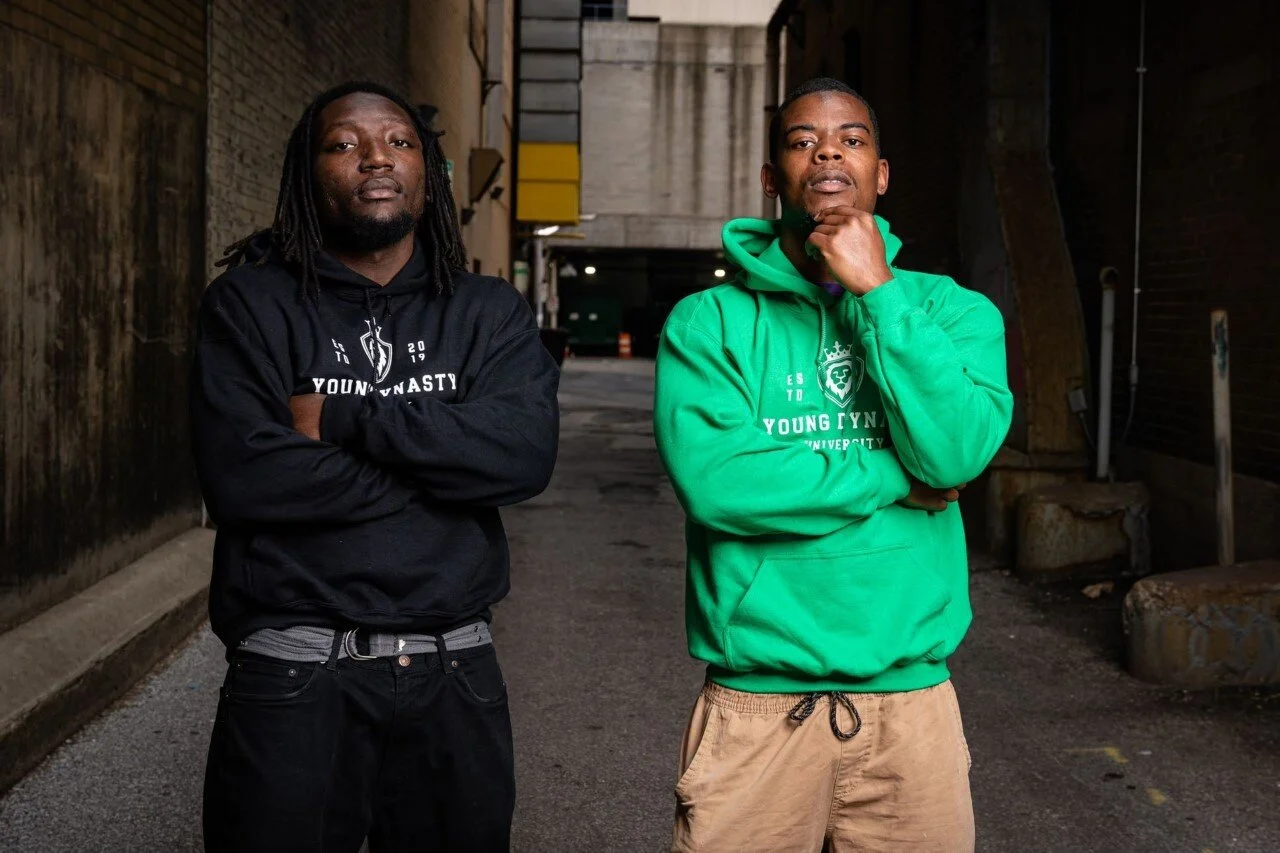 Two young men stand in an alleyway, arms crossed, wearing hoodies with 'Young Dynasty University' logos, one in black and one in green, with a gritty urban background.