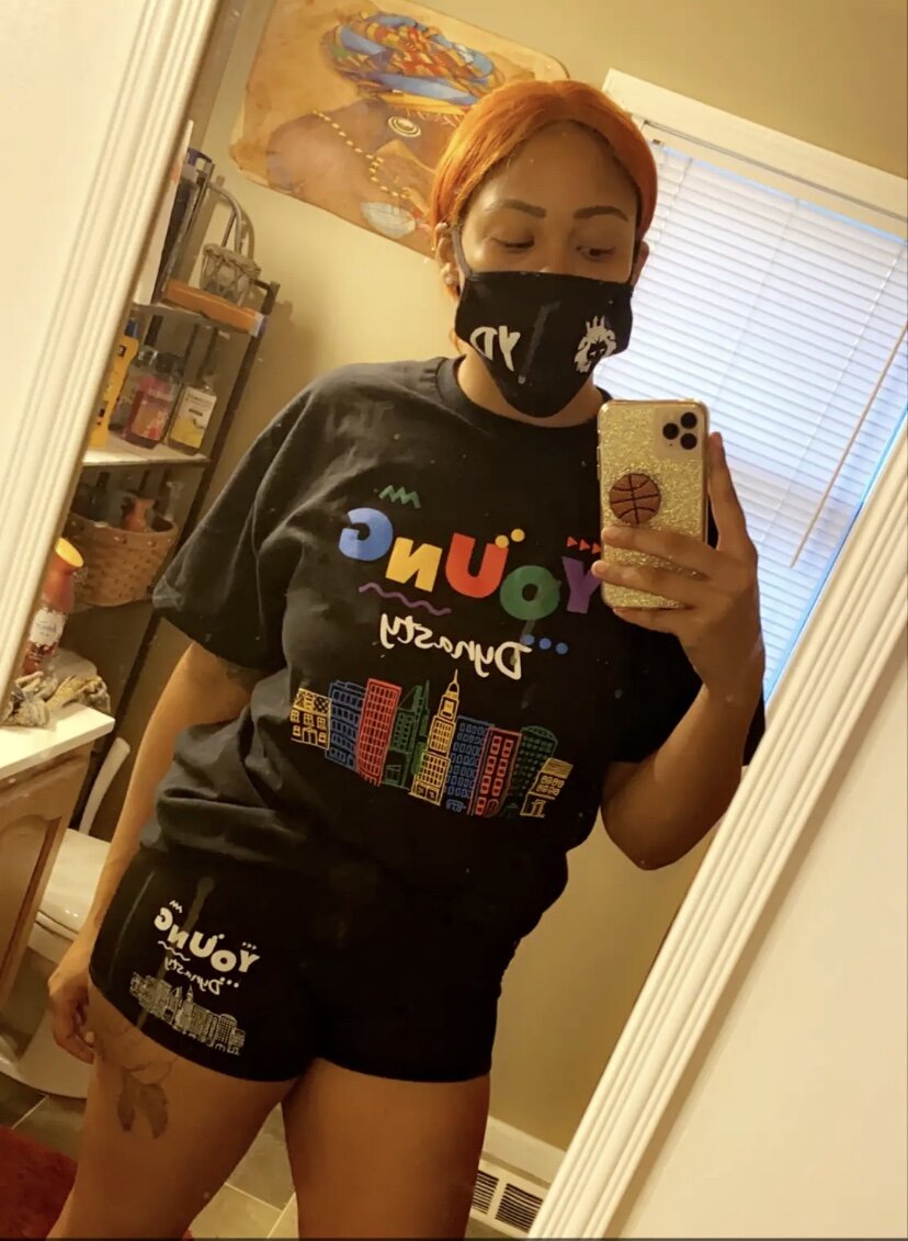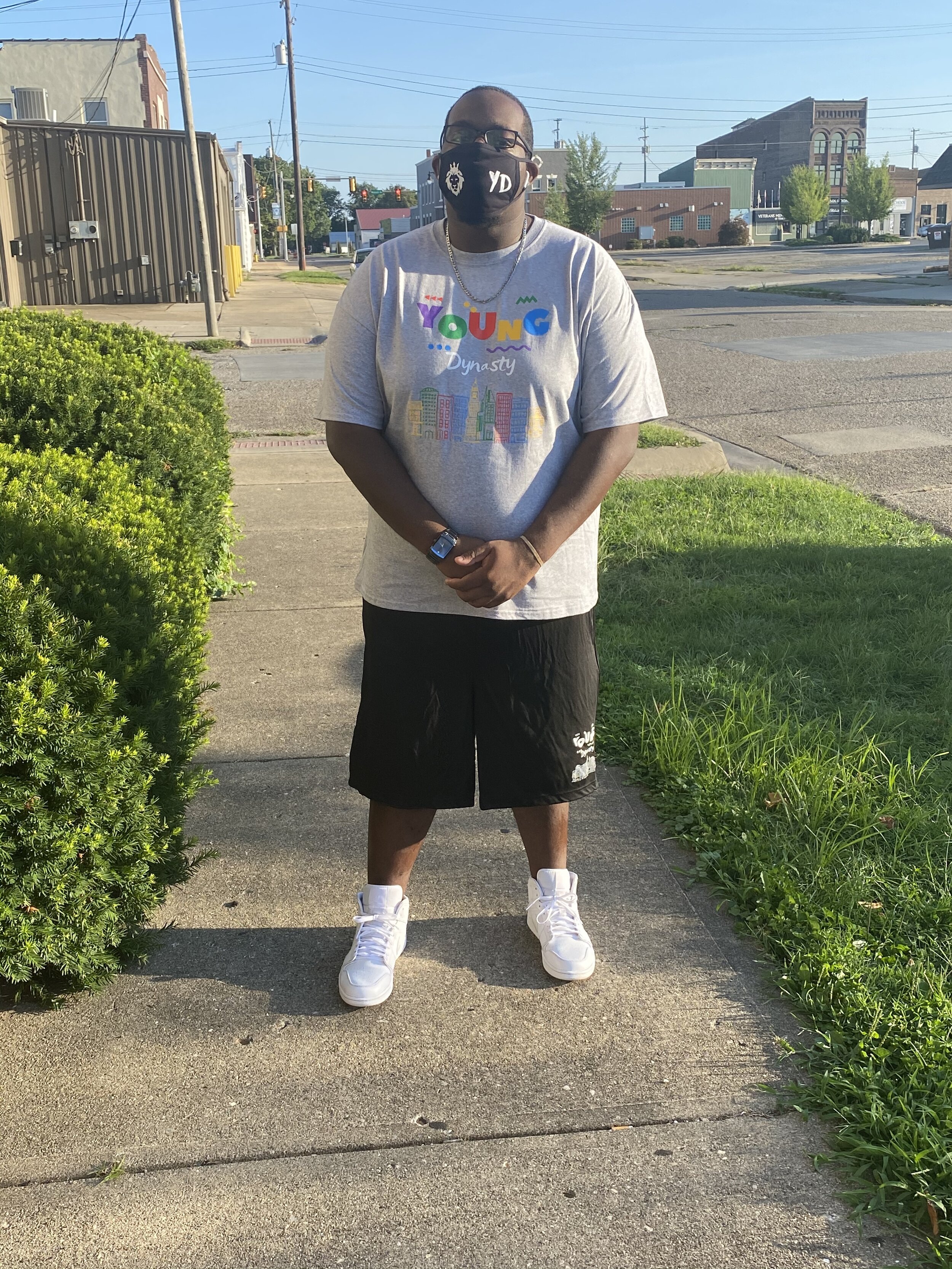 Young man standing on sidewalk wearing black T-shirt with colorful text 'Young Dynasty' and a cityscape graphic, black shorts, black sneakers, a black face mask, and gold necklaces, with satellite dishes on a building behind him and greenery on the s