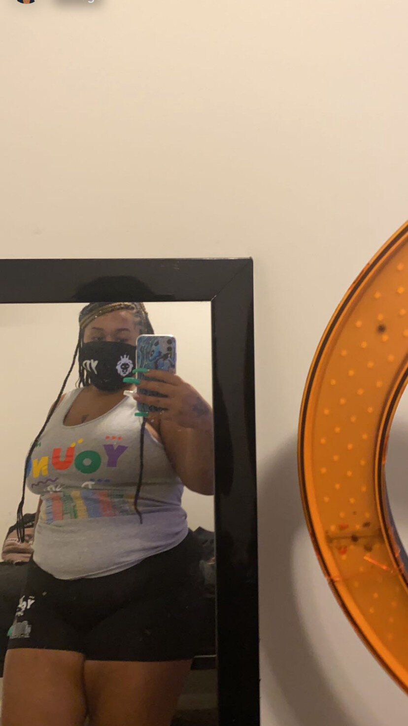 A woman taking a mirror selfie, wearing a black face mask, a sleeveless top with colorful text, and black shorts.
