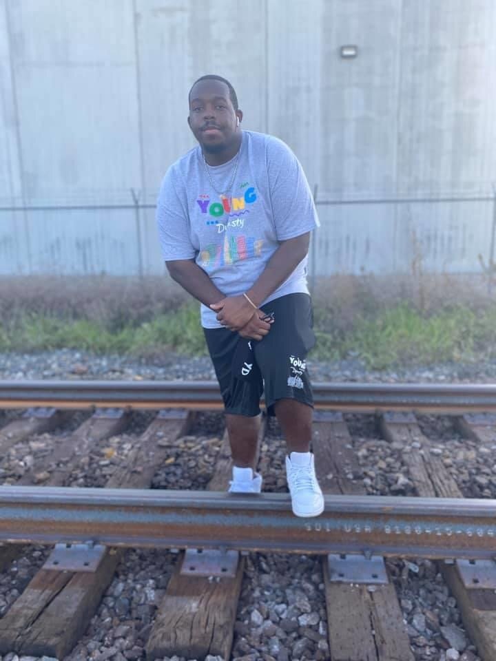 A young man standing on a railroad track, wearing a gray t-shirt with colorful text, black shorts, and white sneakers, with a fence and grass in the background.