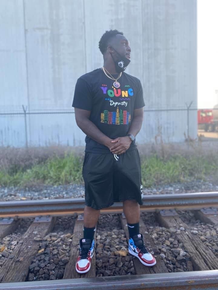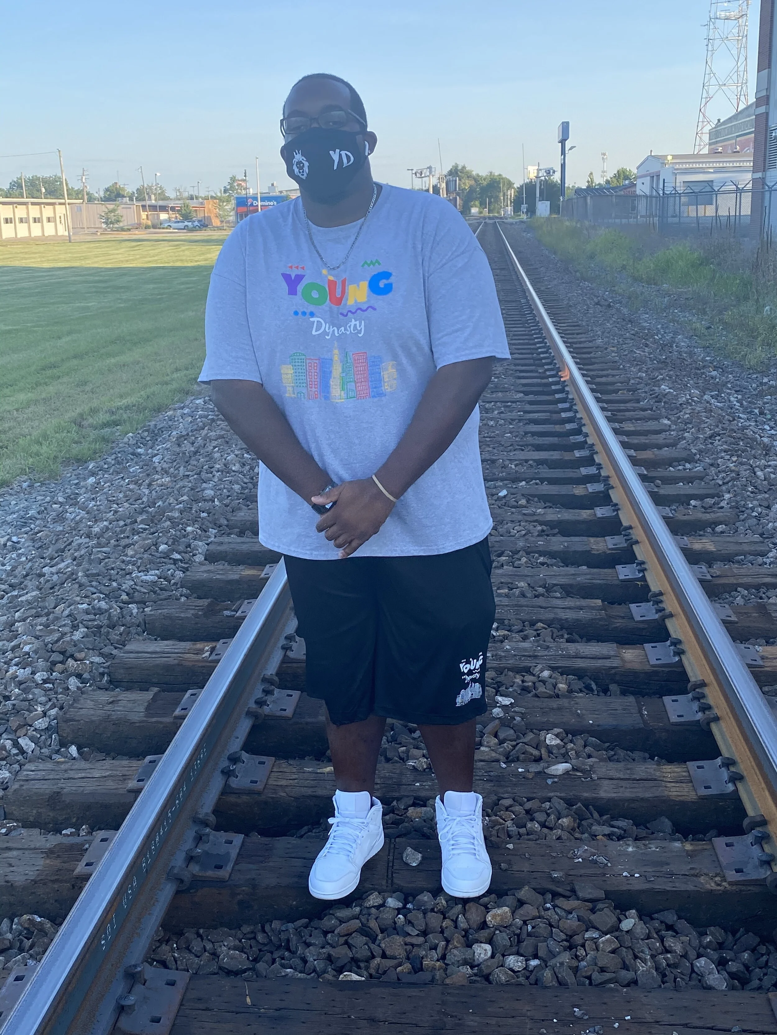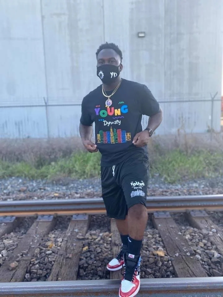 Young man in black athletic outfit with colorful 'Young Dynasty' shirt, black face mask, and colorful sneakers, standing on train tracks.