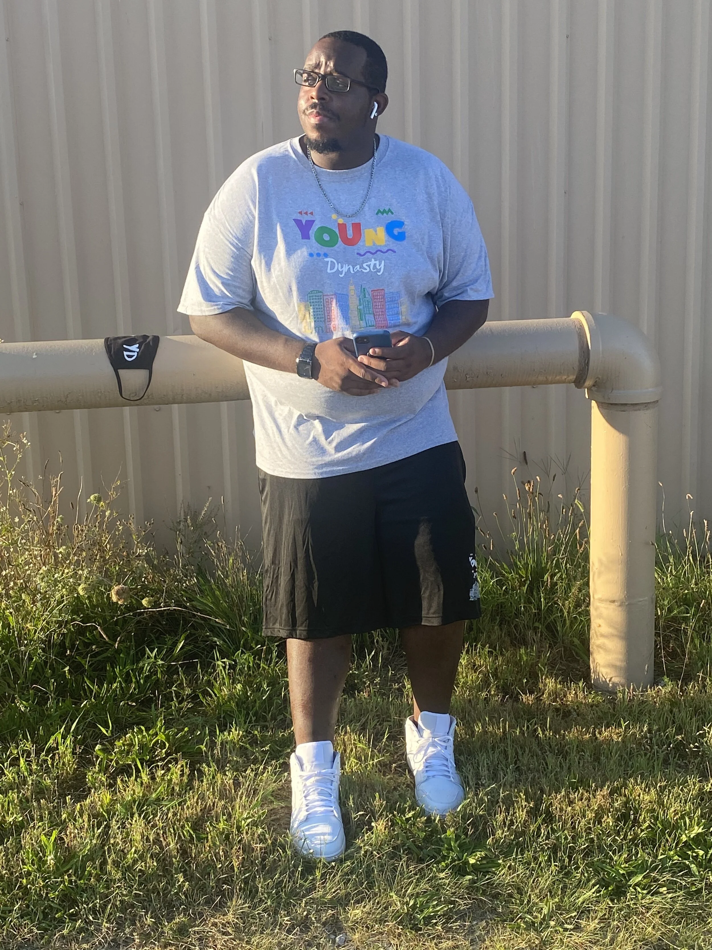 A man standing outdoors near a beige metal fence, wearing a gray t-shirt that says 'Young Dynasty' with colorful graphics, black shorts, white sneakers, sunglasses, and earbuds, holding a smartphone in his hands.