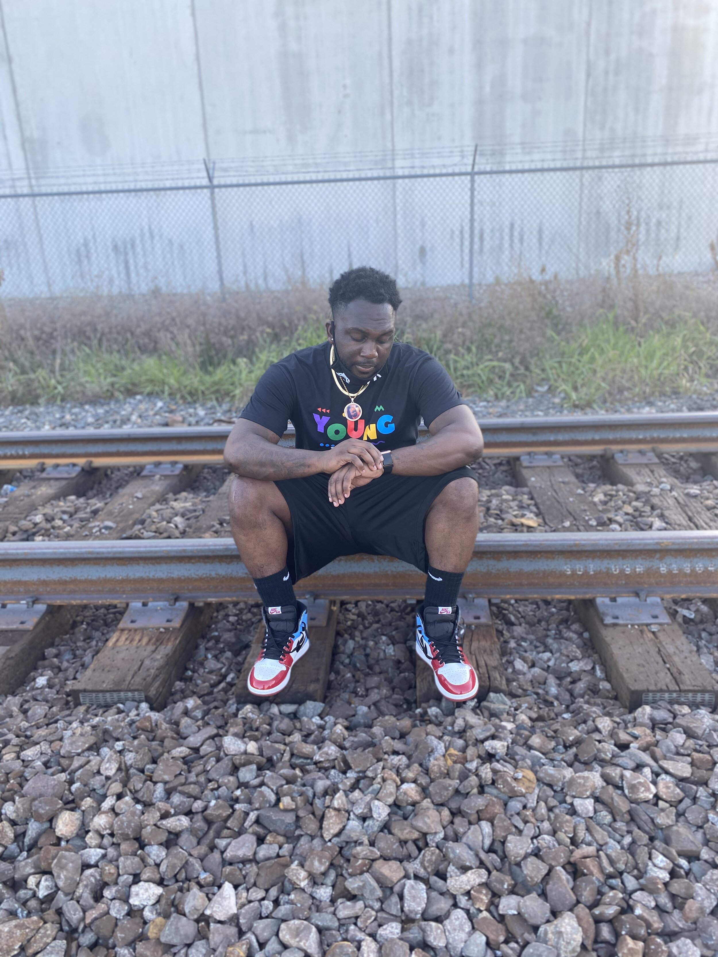 A man wearing a black 'YOUNG' t-shirt, black shorts, and Nike sneakers sitting on train tracks with a chain necklace, looking down at his watch. Behind him is a fence and a concrete wall.
