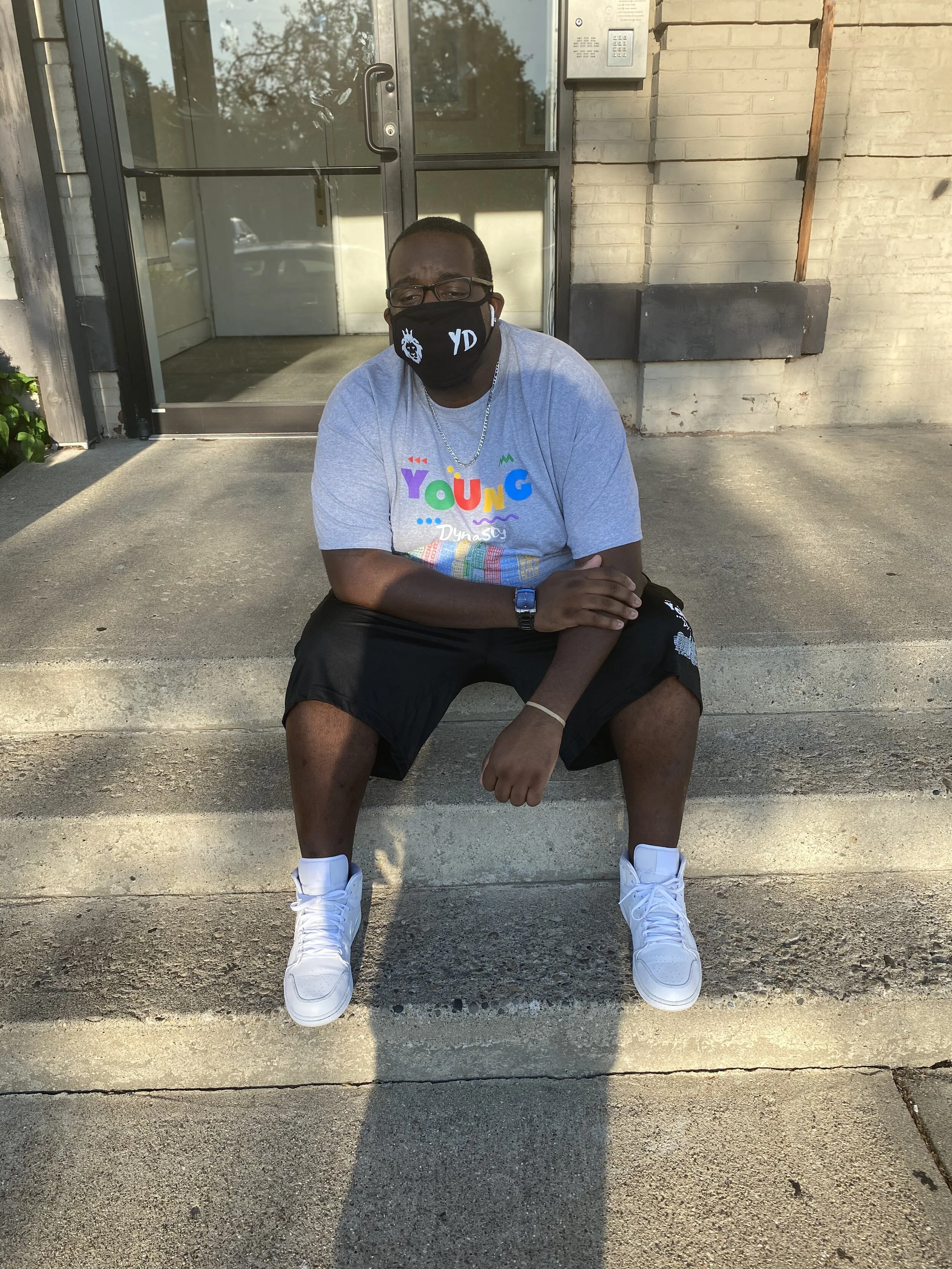 Young man sitting on a concrete step outside a building, wearing a gray t-shirt, black shorts, white sneakers, a black face mask, glasses, and a wristwatch.
