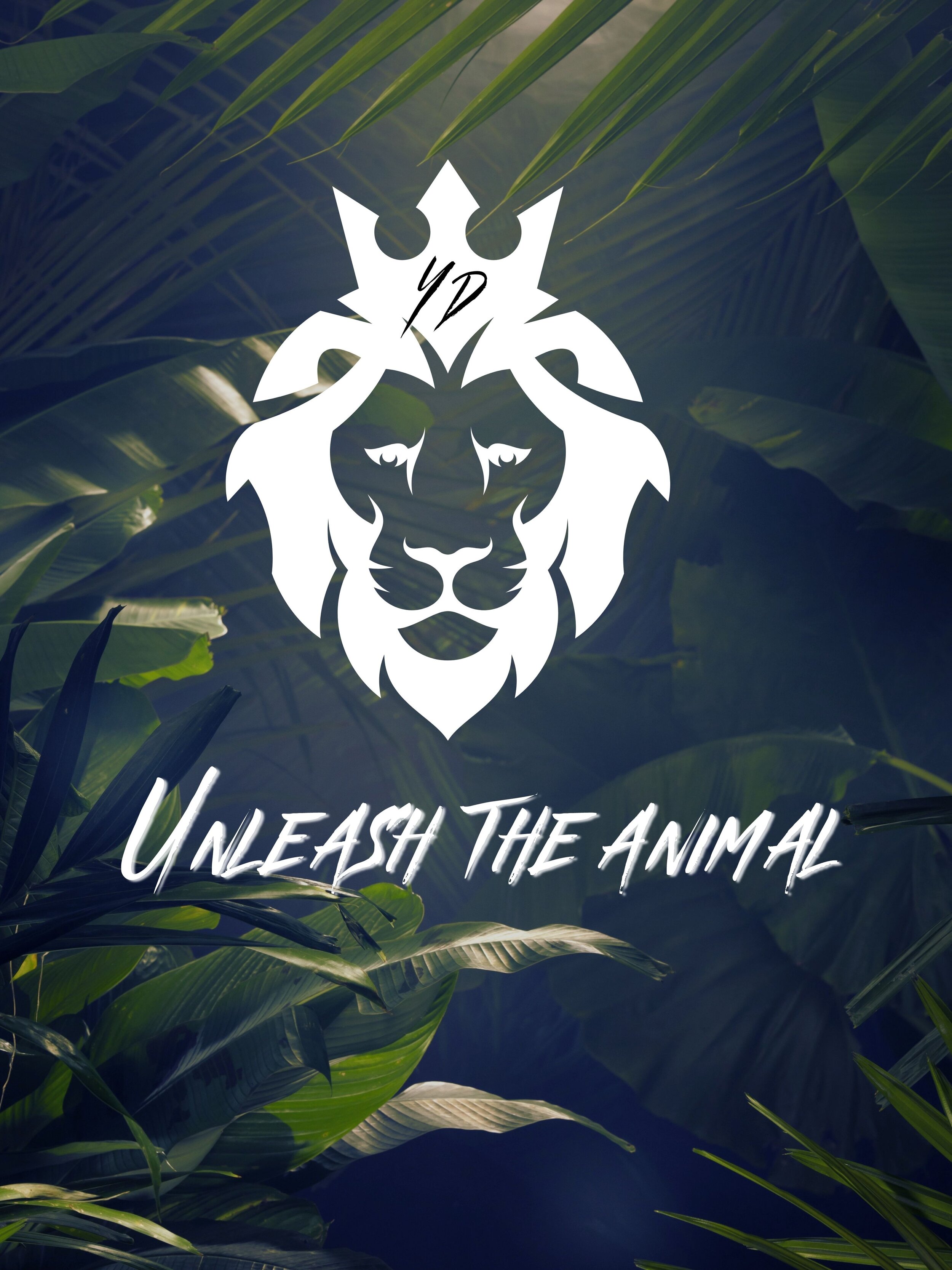 A graphic of a lion's face with a crown and the letters 'YD' above it. The background features dark green jungle or tropical leaves, with the text 'Unleash The Animal' written below in a stylized font.