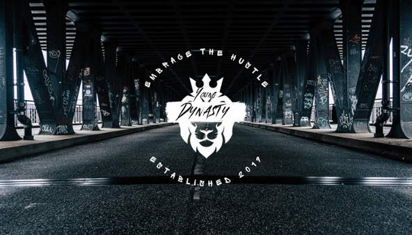 Urban skyline at sunset with silhouettes of high-rise buildings, overlayed with text reading "Young Dynasty" and "Embrace Your Hustle" along with a lion's head logo.