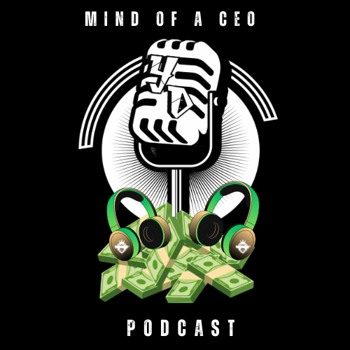 Design for 'Mind of a CEO' podcast featuring a stylized microphone, a large dollar bill, and headphones.