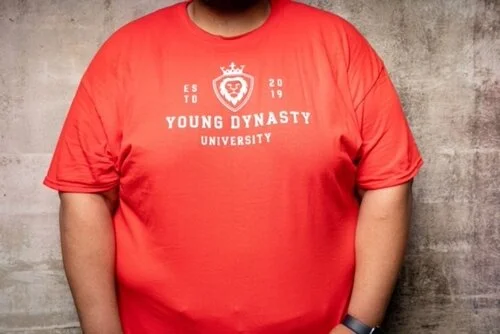 Person wearing a red T-shirt with a Young Dynasty University logo, standing against a concrete wall.