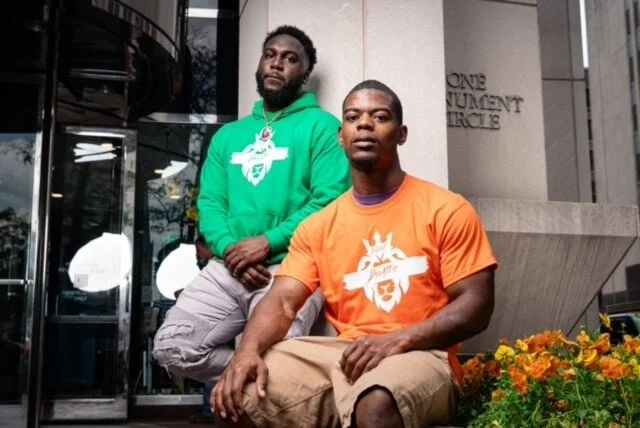 Two men walking and talking outside of a building with the sign 'INDIANAPOLIS BUSINESS J...' and 'NATIONAL BANK.' One man is wearing a black hoodie and the other an orange hoodie, both with a logo featuring a crowned lion's head.