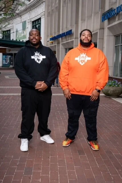 Two men standing in front of a building, wearing hoodies with a lion logo, one in black and one in orange, looking confident.